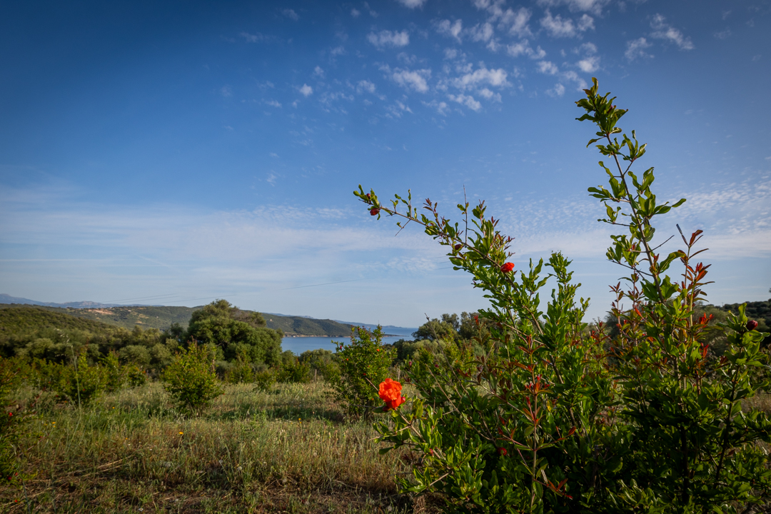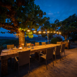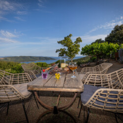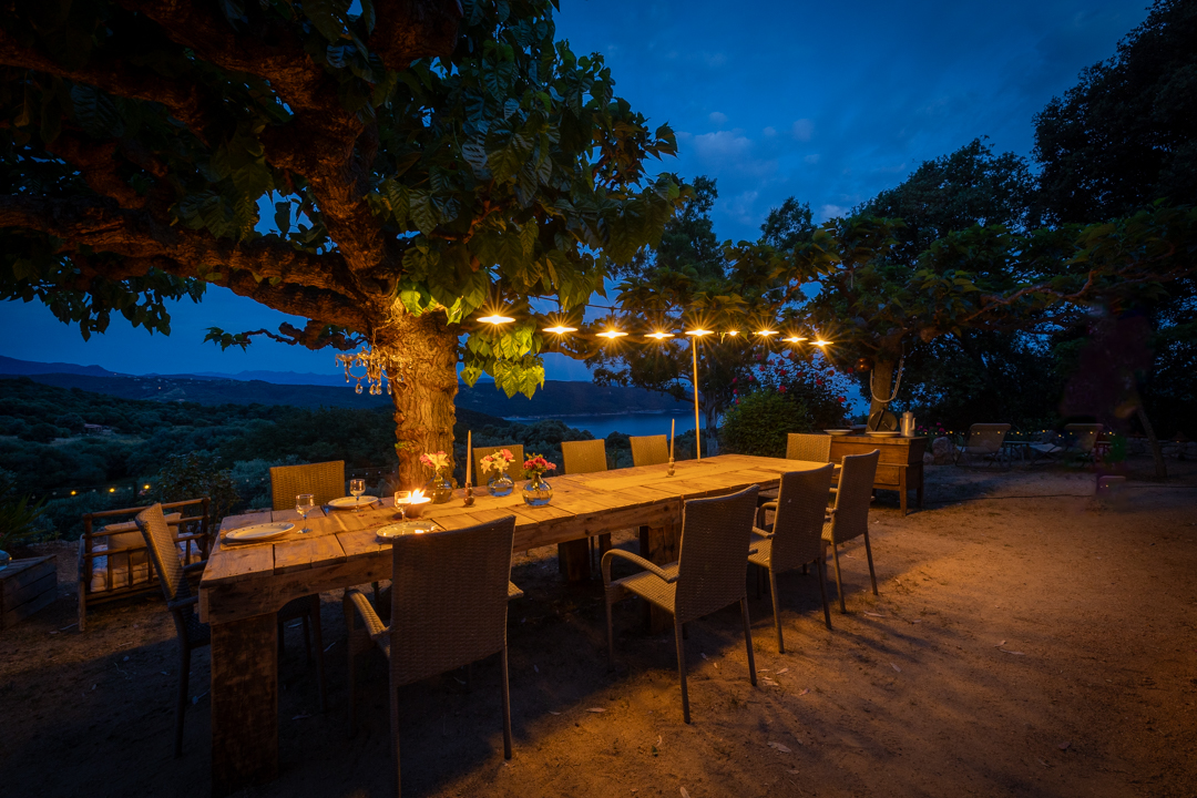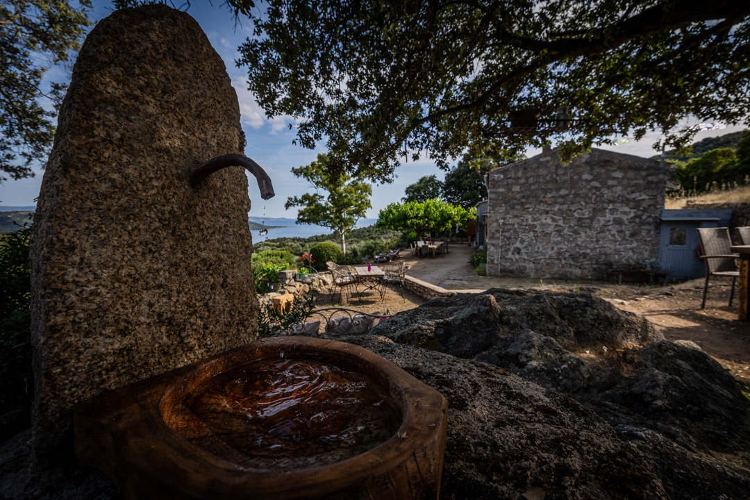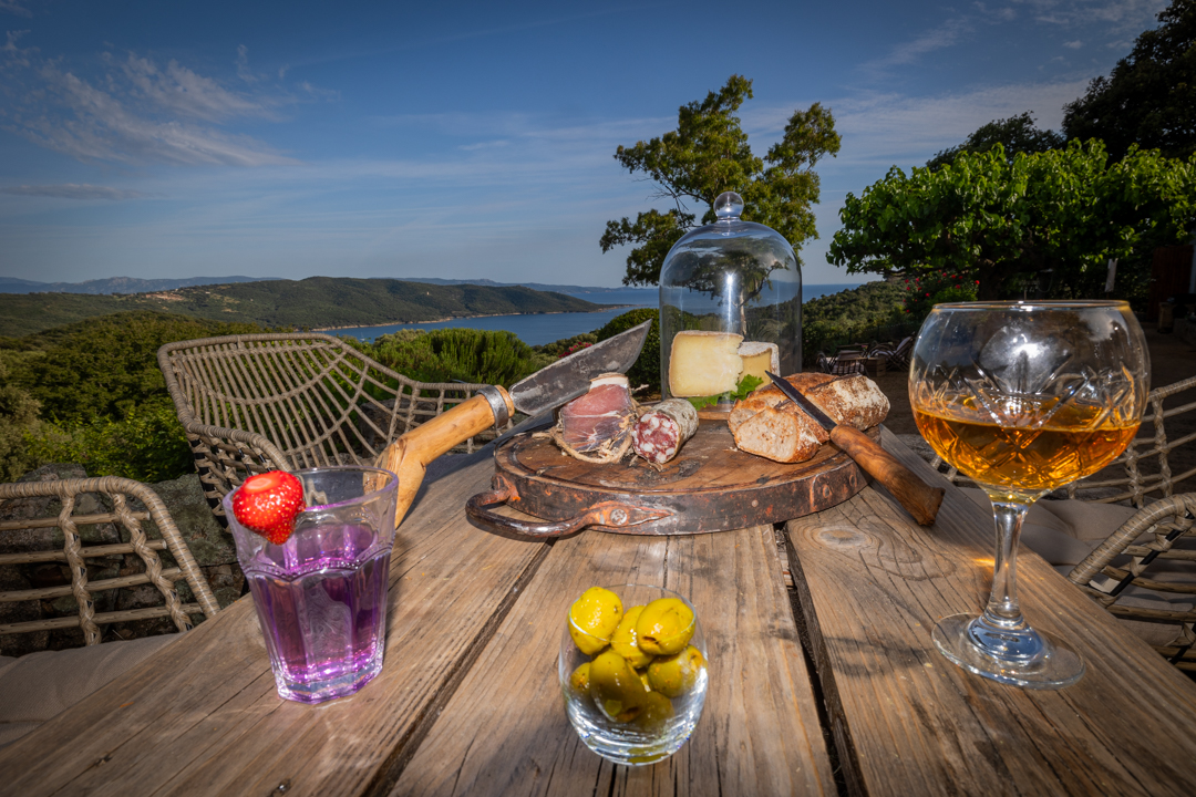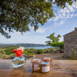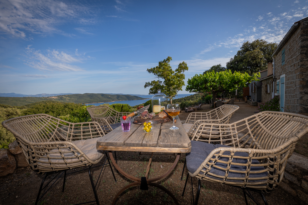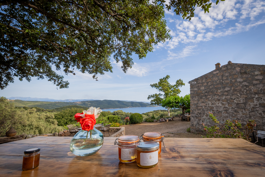 Nichée au-dessus d’une plantation de grenadiers et d’un potager de 25 hectares à Coti-Chiavari, cette table d’hôtes champêtre fait face à la baie de Cupabia. Ici, tout est fait maison avec les fruits et légumes du jardin et les produits de producteurs locaux (charcuterie artisanale, fromages fermiers du village, pain cuit au feu de bois, vins de la région) : sirop et limonade à la lavande, oeuf cocotte, pagre aux herbes, carpaccio de tomate en choux et mousse de chèvre frais au pesto de pistache, panna cotta à la bisque de homard et chantilly au safran, tarte butternut, chèvre, lardons et noisettes, confitures à la grenade, tarte à la figue et au citron, tiramisù à la poire ou à la grenade, glaces maison… Le menu change au gré des récoltes et des saisons. La table fermière prend parfois des airs de veillée corse où les chants s’invitent au repas.