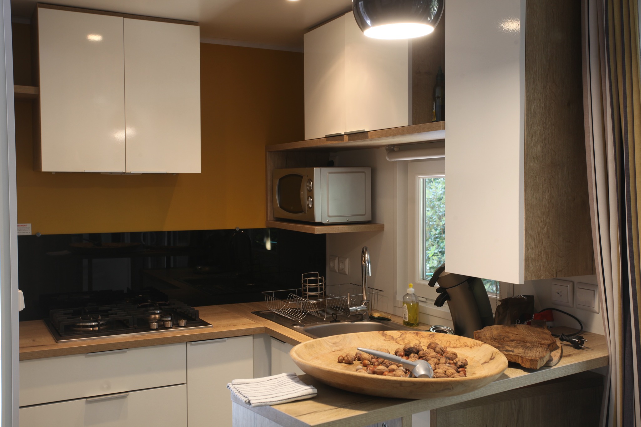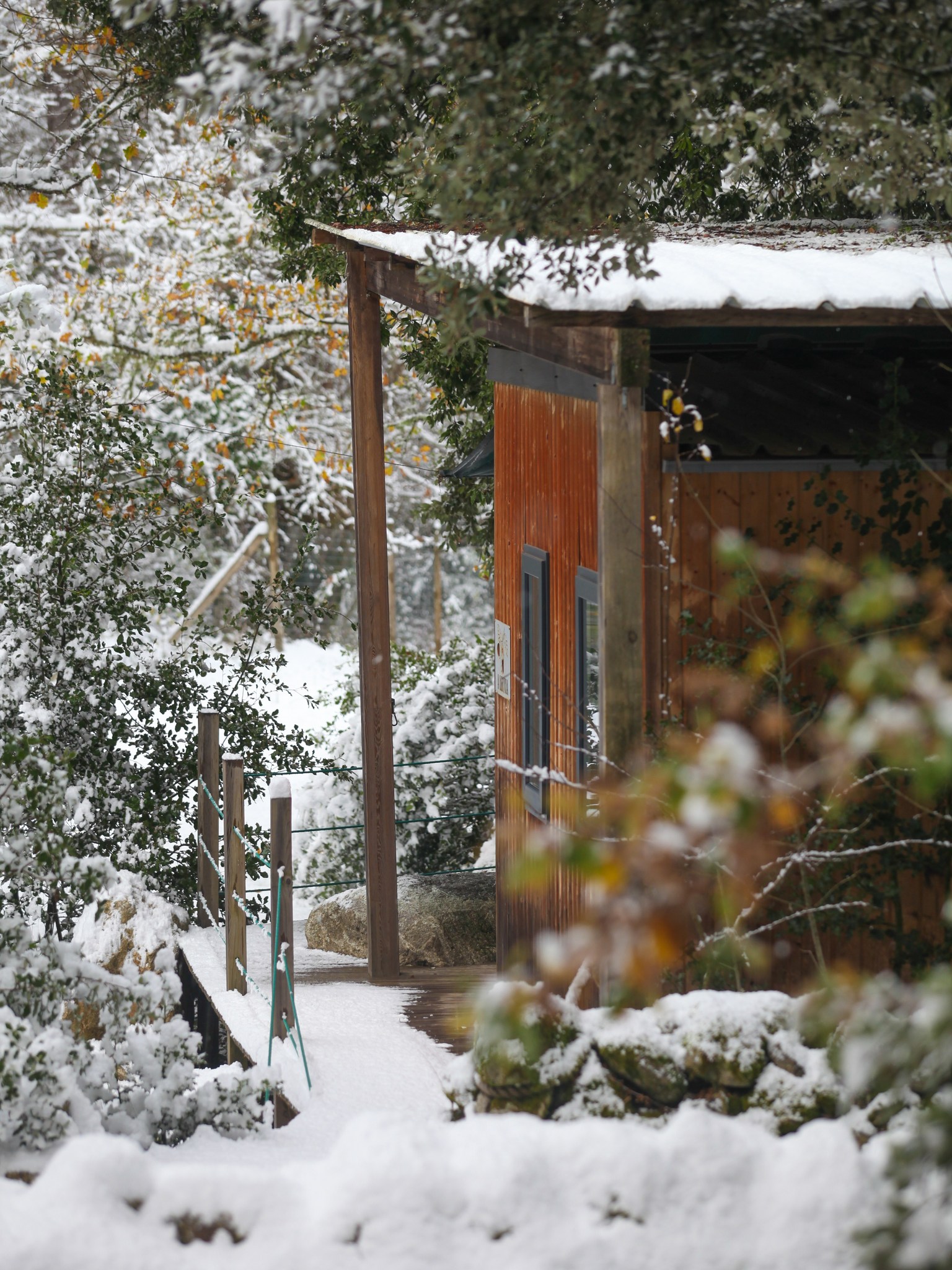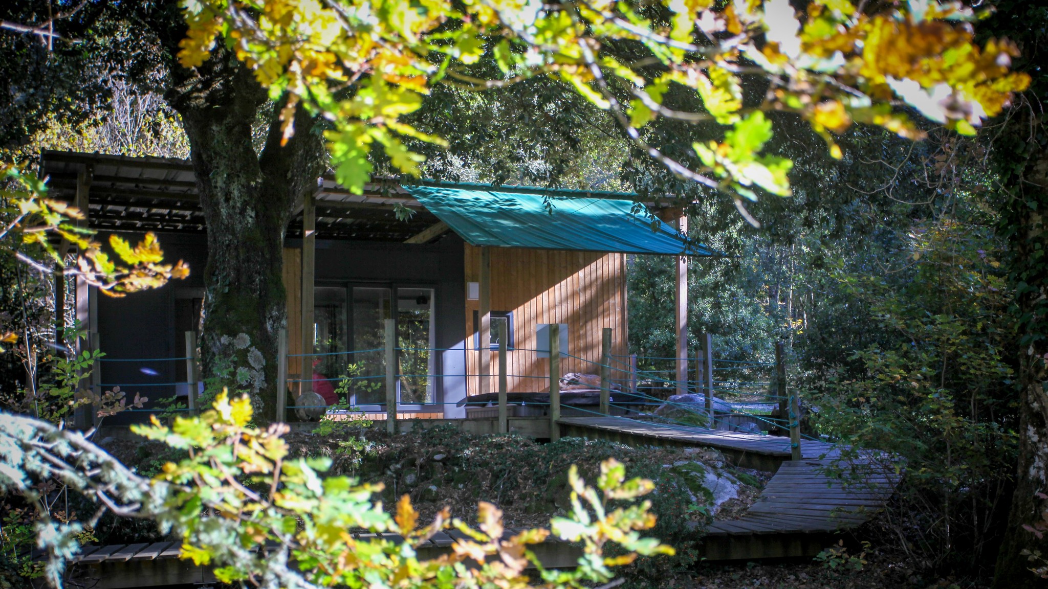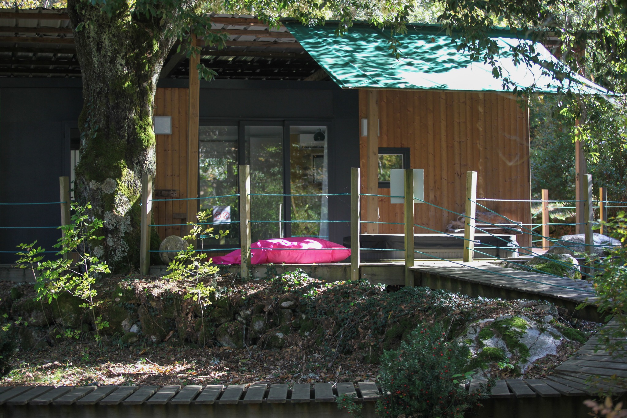 Ce chalet en bois prend racine au milieu de 35 espèces d’arbres, au pied du Monte d’Oro, dissimulé dans un cadre sauvage préservé qui s’étend sur 2 hectares et demi à Tattone. Au bord d’une rivière, les 6 chalets sont équipés d’une terrasse de 50m², d’un bain à remous privatif sous les chênes et d’un barbecue pour vos grillages d’été et figatelli d’hiver. Tous sont isolés et n’ont pas de vis-à-vis les uns avec les autres et disposent d’une entrée indépendante et d’une place de parking privée. À l’intérieur, ils se composent de deux chambres avec lits doubles et canapé-lit dans le salon pour 4 chalets (dont celui-ci) et pour les 2 autres, d’une troisième chambre avec lits superposés et d’un canapé simple dans le salon. Tous sont également composés d’une salle de bains avec toilettes séparées et d’une cuisine équipée. Depuis chaque chalet, on peut suivre une passerelle qui conduit à un espace ouvert avec des transats pour admirer les étoiles la nuit ou se dorer la pilule le jour. Pour la vue, c’est le Monte d’Oru qui s’impose avec son pic à 2 389 mètres d’altitude. Les passionnés de nature ne manqueront pas d’air entre les châtaigniers, houx, noisetiers, pins laricci, chênes, noyers, et autres arbres fruitiers (la liste s’étend tout de même à 35 espèces d’arbres). Profitez du bar et de la pizzeria du camping en saison (du même propriétaire, non loin mais suffisamment pour ne pas croiser les vacanciers ni même les entendre). Et pour regagner les villes principales, la traditionnelle Micheline aussi appelée u trinichellu se trouve à seulement 300 mètres de cette adresse. C’est ce que l’on appelle du dépaysement en pleine nature mais bien desservi.