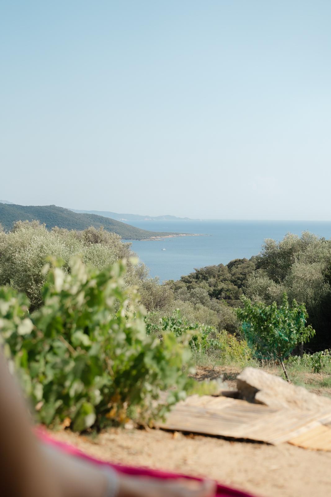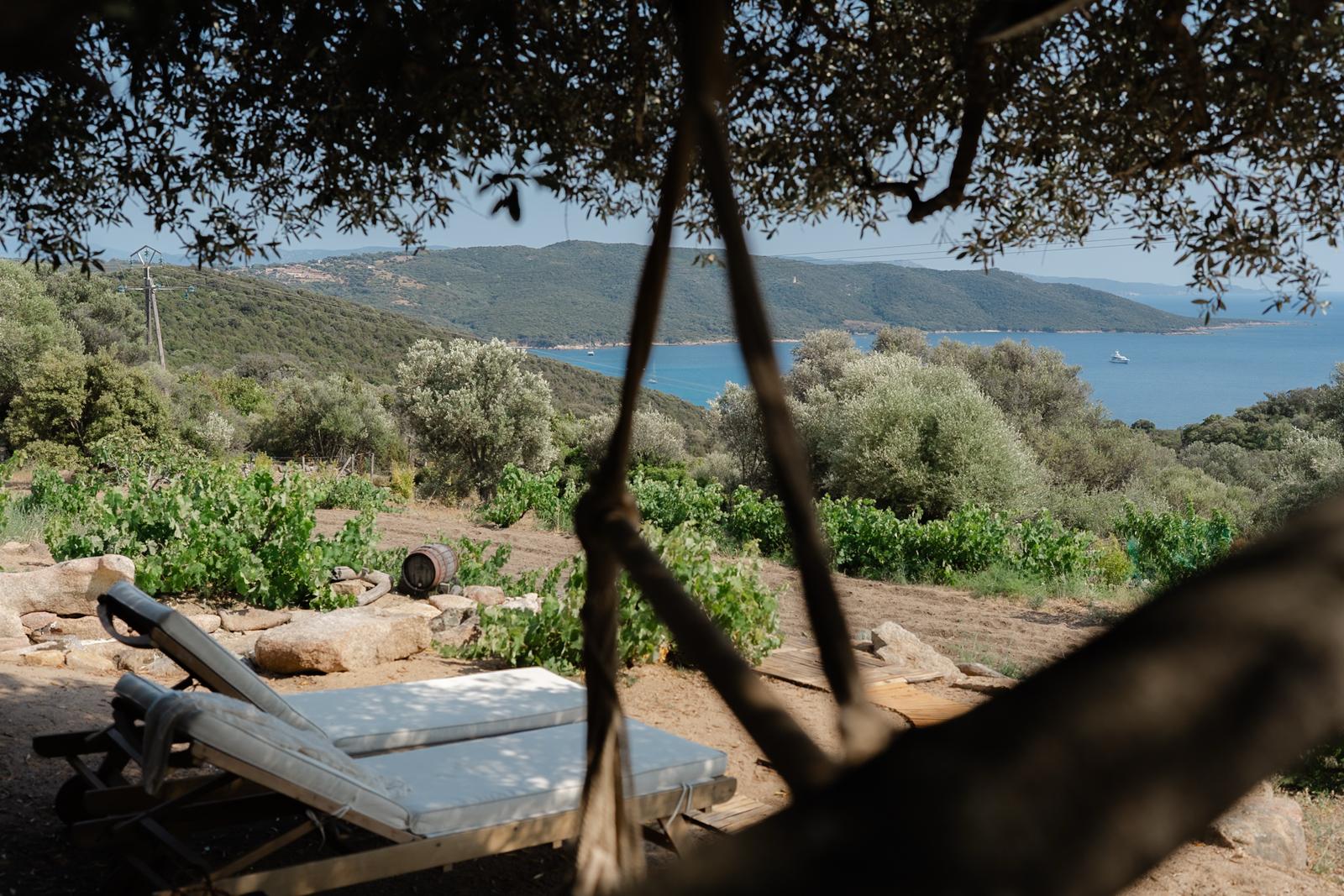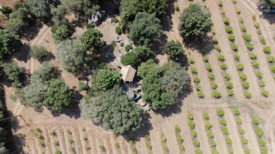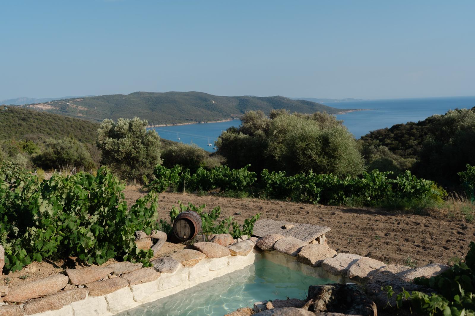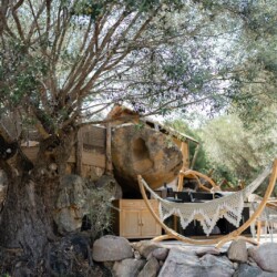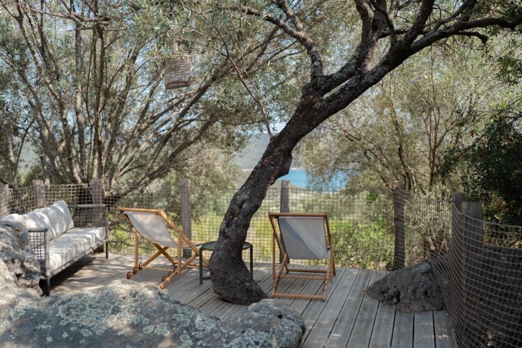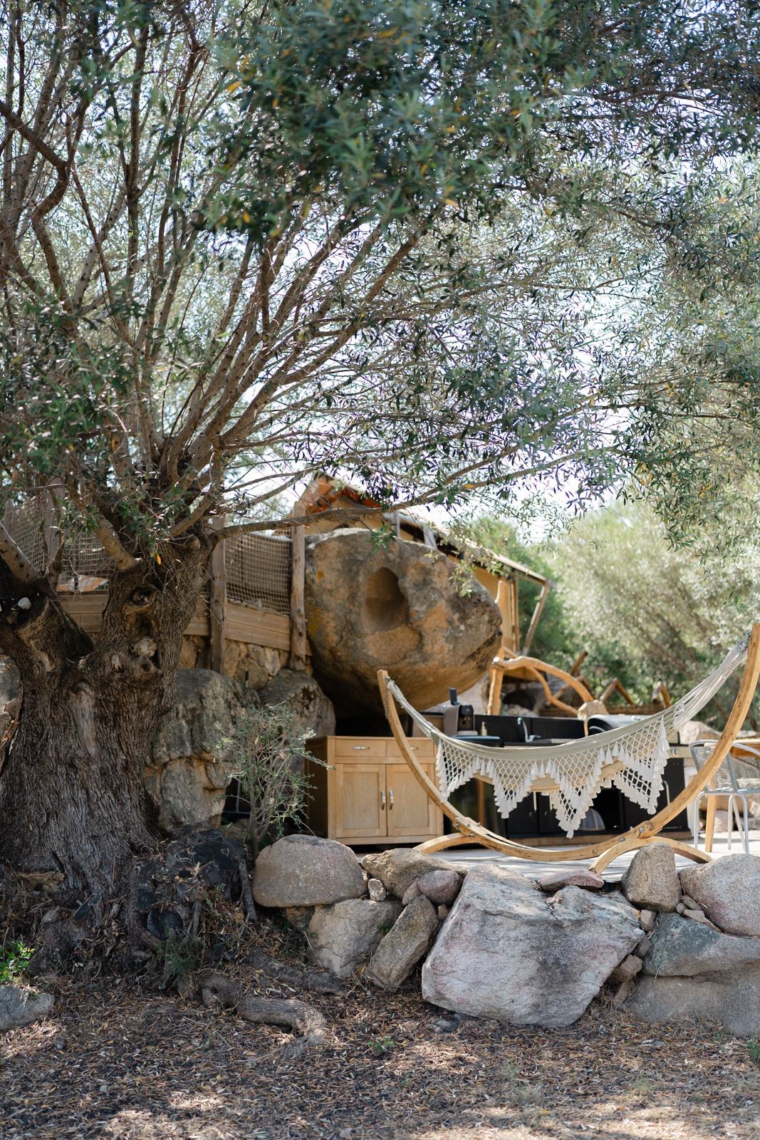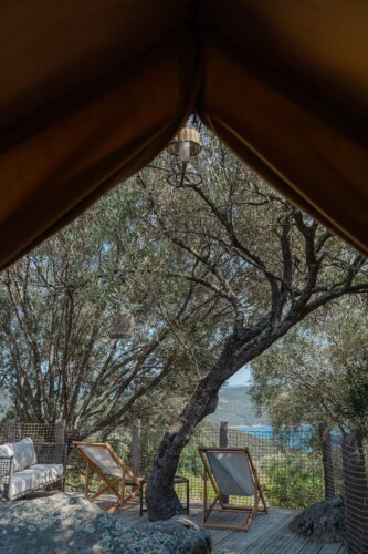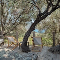 Au cœur d’un champ de grenades de 25 hectares, cette tente lodge perchée sur un rocher offre une vue panoramique sur la baie de Cupabia. Ce nid douillet pour 2 personnes est climatisé et équipé d’un lit double à l’abri d’une moustiquaire, d’une kitchenette extérieure, d’une salle de bain en plein air sculptée dans la roche et de WC en dur sous les chênes. Un bassin en pierre invite à la baignade sur l’autre extrémité du domaine, à 500 mètres de la tente. À proximité, un sentier mène à la plage en 15 minutes. 100 mètres au-dessus de la plantation de grenadiers et potager, une table d’hôtes est proposée avec au menu : les produits du jardin et de producteurs voisins et quelques fois, des chants corses s’invitent à table.