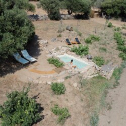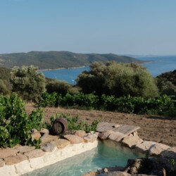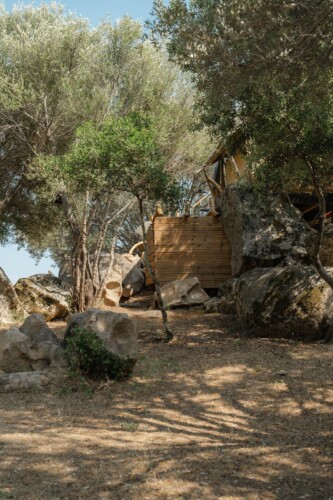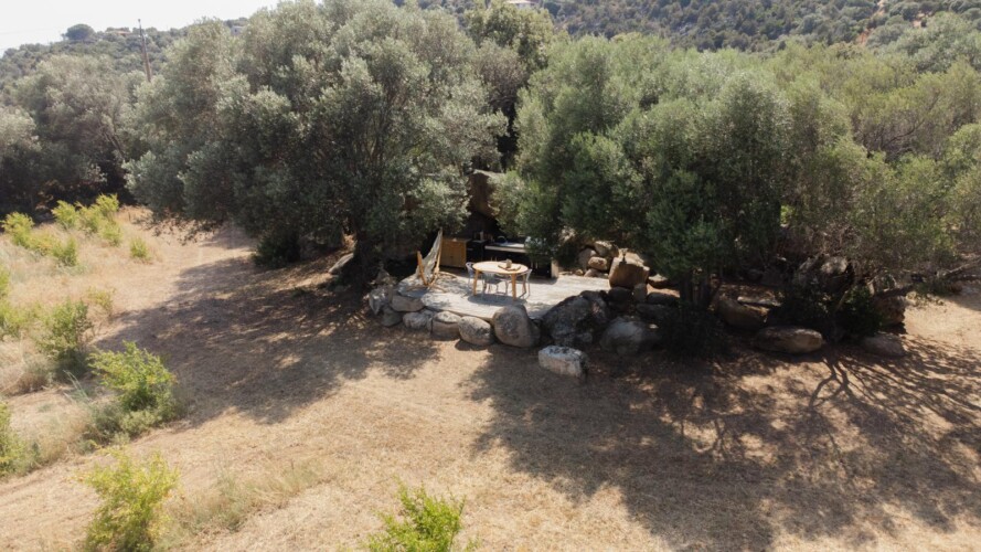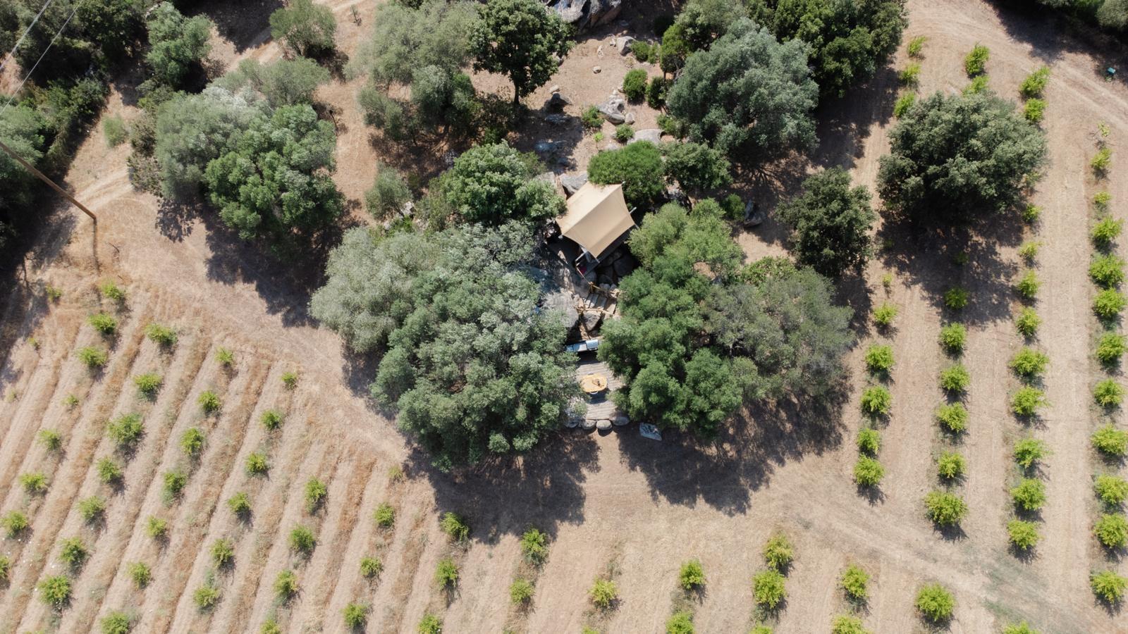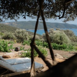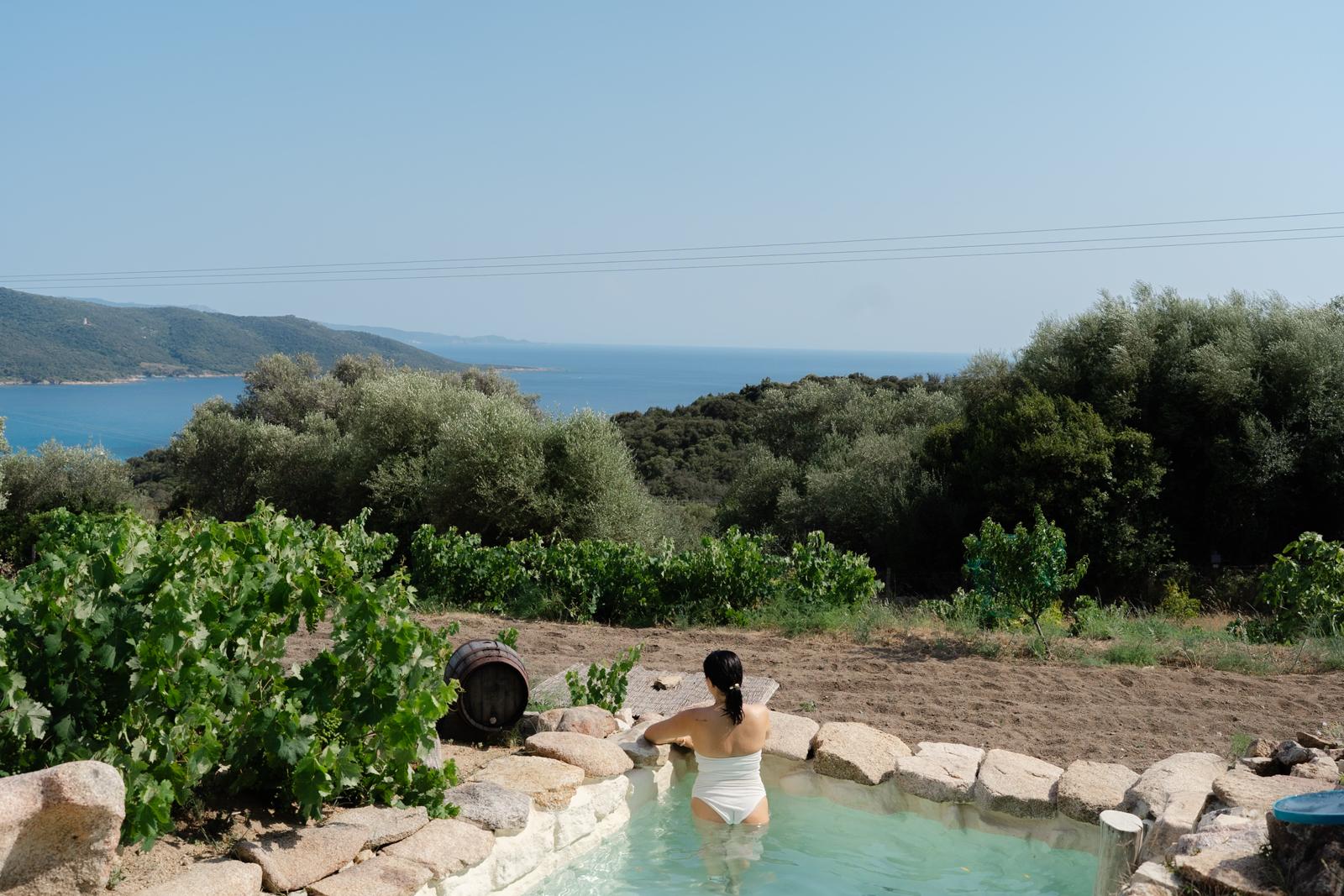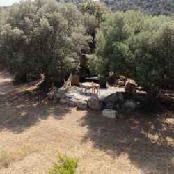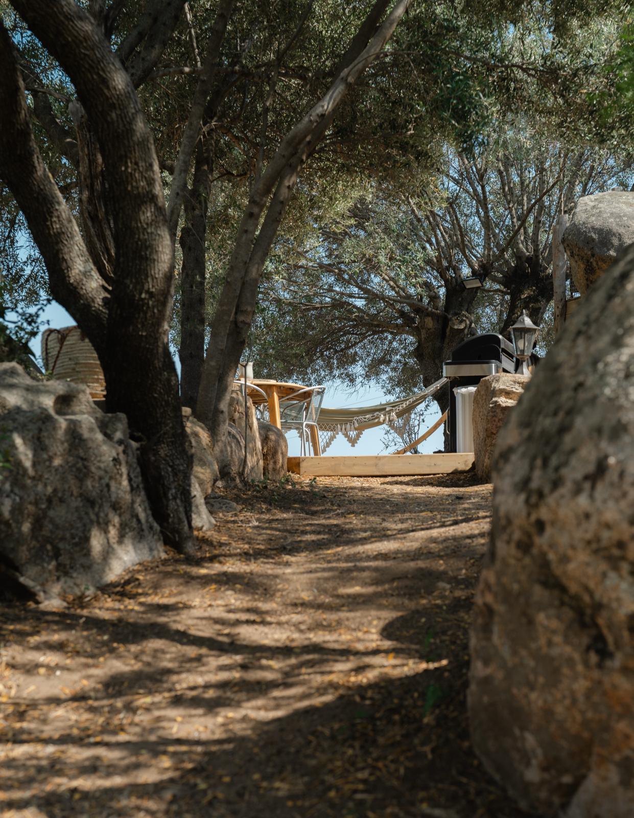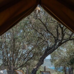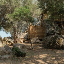 Au cœur d’un champ de grenades de 25 hectares, cette tente lodge perchée sur un rocher offre une vue panoramique sur la baie de Cupabia. Ce nid douillet pour 2 personnes est climatisé et équipé d’un lit double à l’abri d’une moustiquaire, d’une kitchenette extérieure, d’une salle de bain en plein air sculptée dans la roche et de WC en dur sous les chênes. Un bassin en pierre invite à la baignade sur l’autre extrémité du domaine, à 500 mètres de la tente. À proximité, un sentier mène à la plage en 15 minutes. 100 mètres au-dessus de la plantation de grenadiers et potager, une table d’hôtes est proposée avec au menu : les produits du jardin et de producteurs voisins et quelques fois, des chants corses s’invitent à table.