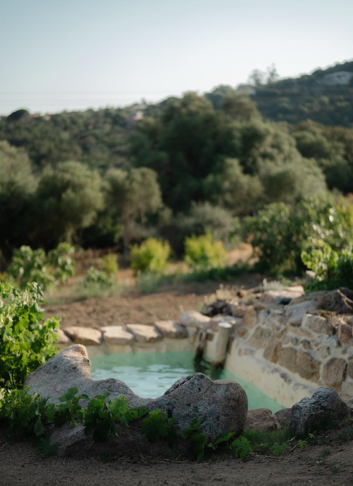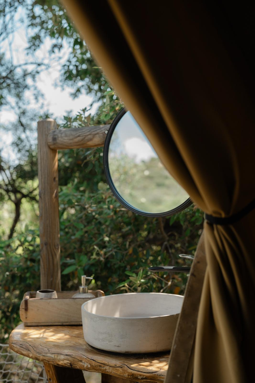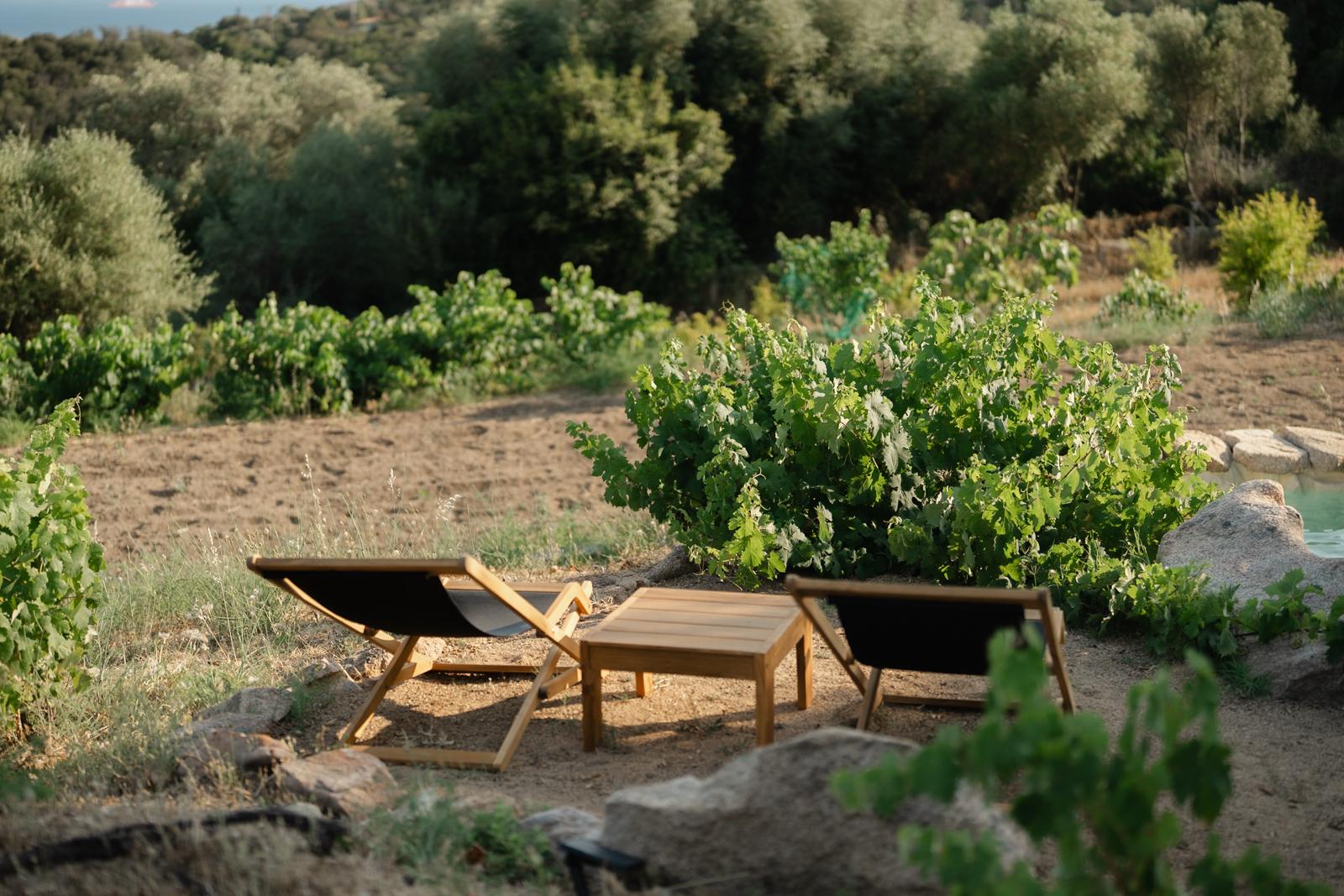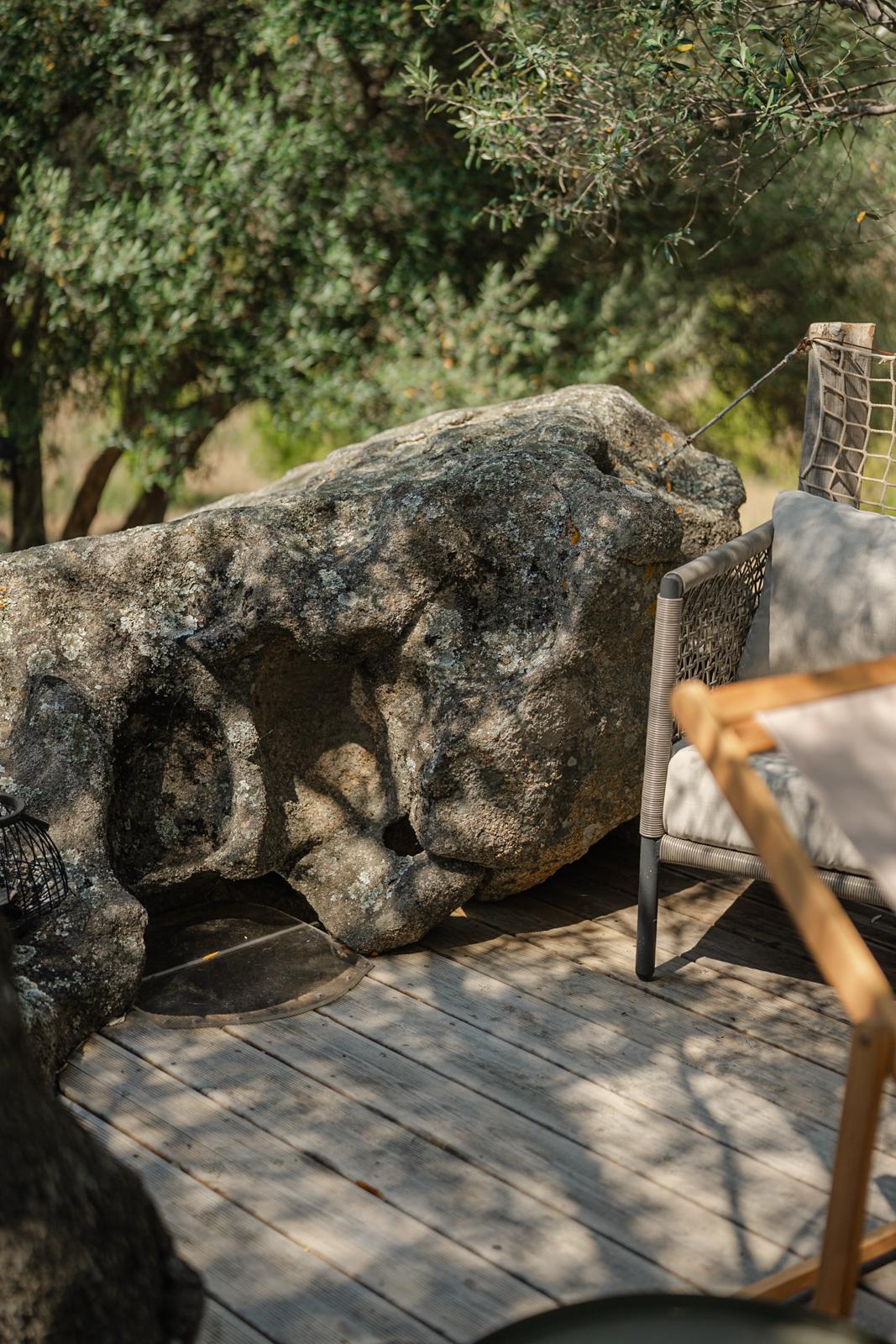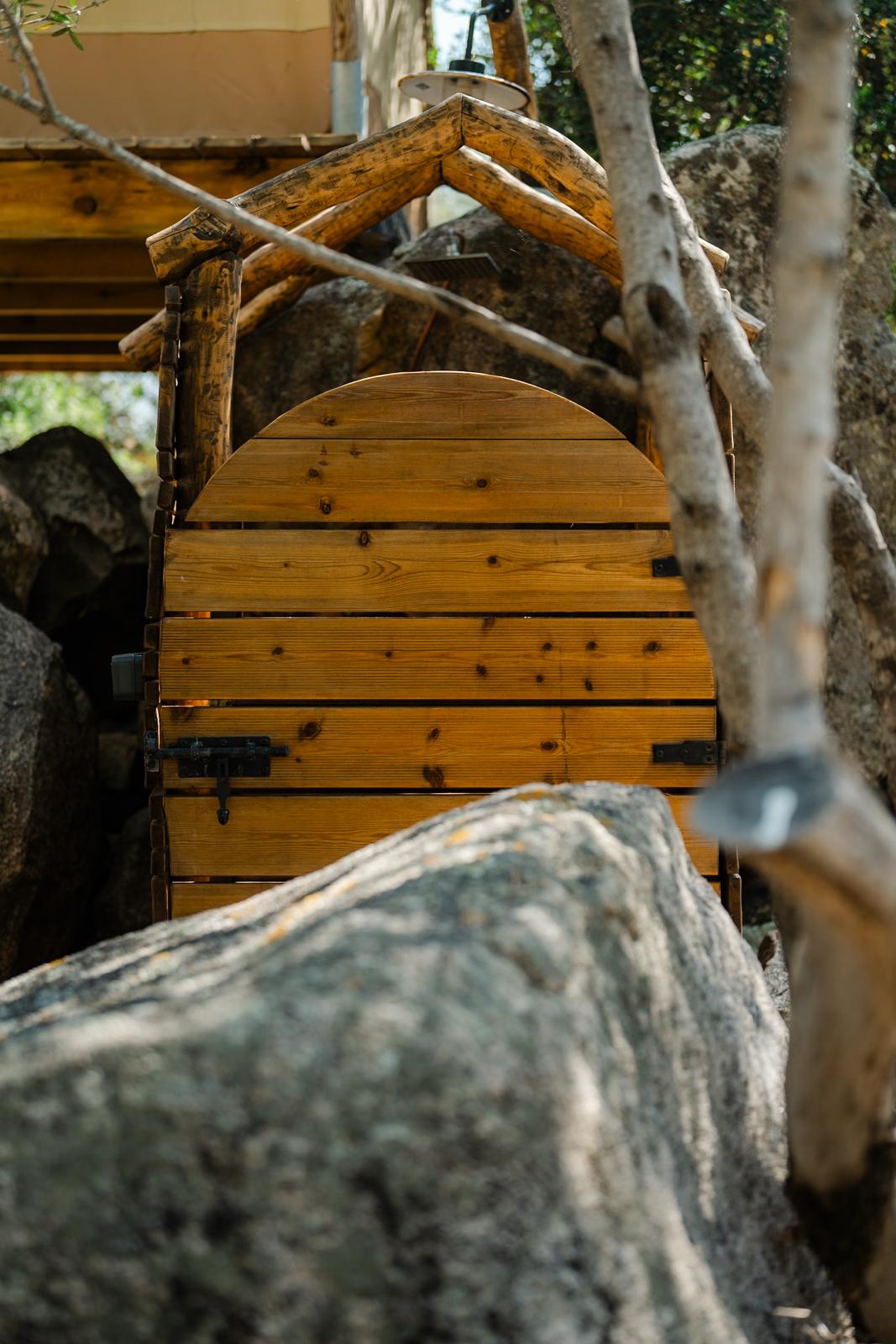 Au cœur d’un champ de grenades de 25 hectares, cette tente lodge perchée sur un rocher offre une vue panoramique sur la baie de Cupabia. Ce nid douillet pour 2 personnes est climatisé et équipé d’un lit double à l’abri d’une moustiquaire, d’une kitchenette extérieure, d’une salle de bain en plein air sculptée dans la roche et de WC en dur sous les chênes. Un bassin en pierre invite à la baignade sur l’autre extrémité du domaine, à 500 mètres de la tente. À proximité, un sentier mène à la plage en 15 minutes. 100 mètres au-dessus de la plantation de grenadiers et potager, une table d’hôtes est proposée avec au menu : les produits du jardin et de producteurs voisins et quelques fois, des chants corses s’invitent à table.